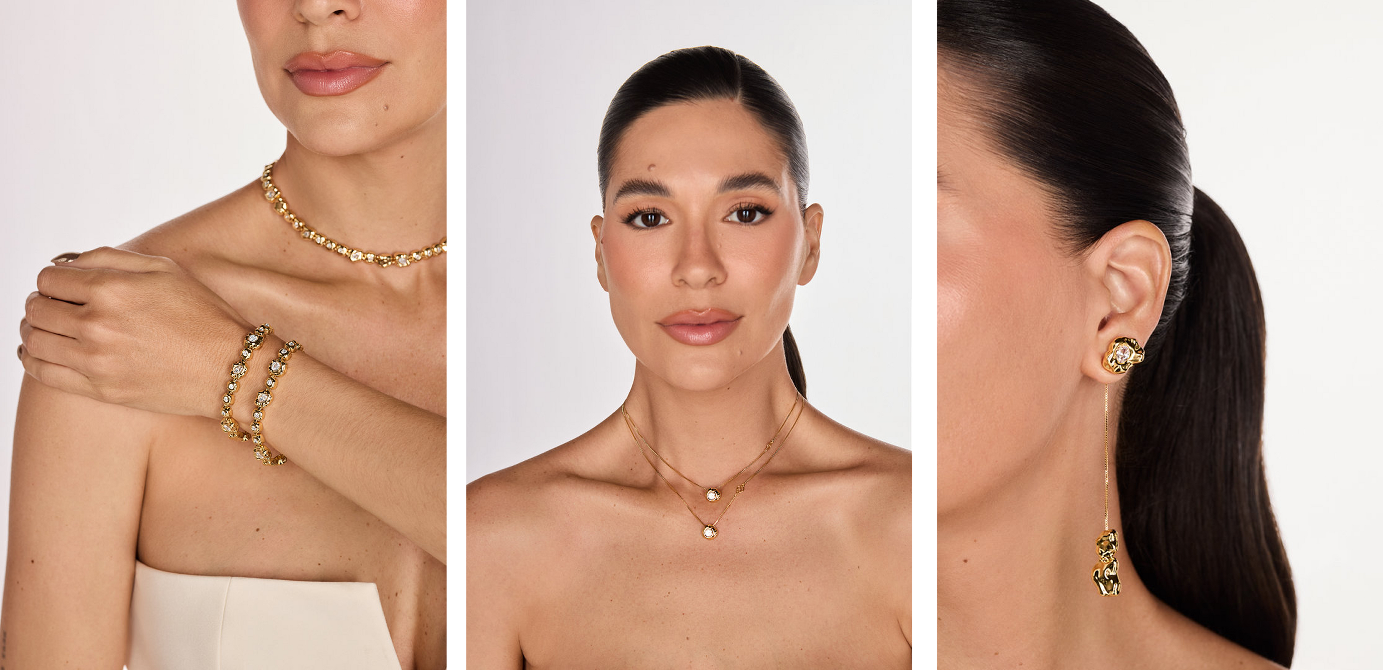 Aqui, o volume e o relevo dão protagonismo ao metal. O encaixe fluido das Zircônias cria uma estética natural — a luz da consciência em um brilho autolapidado.