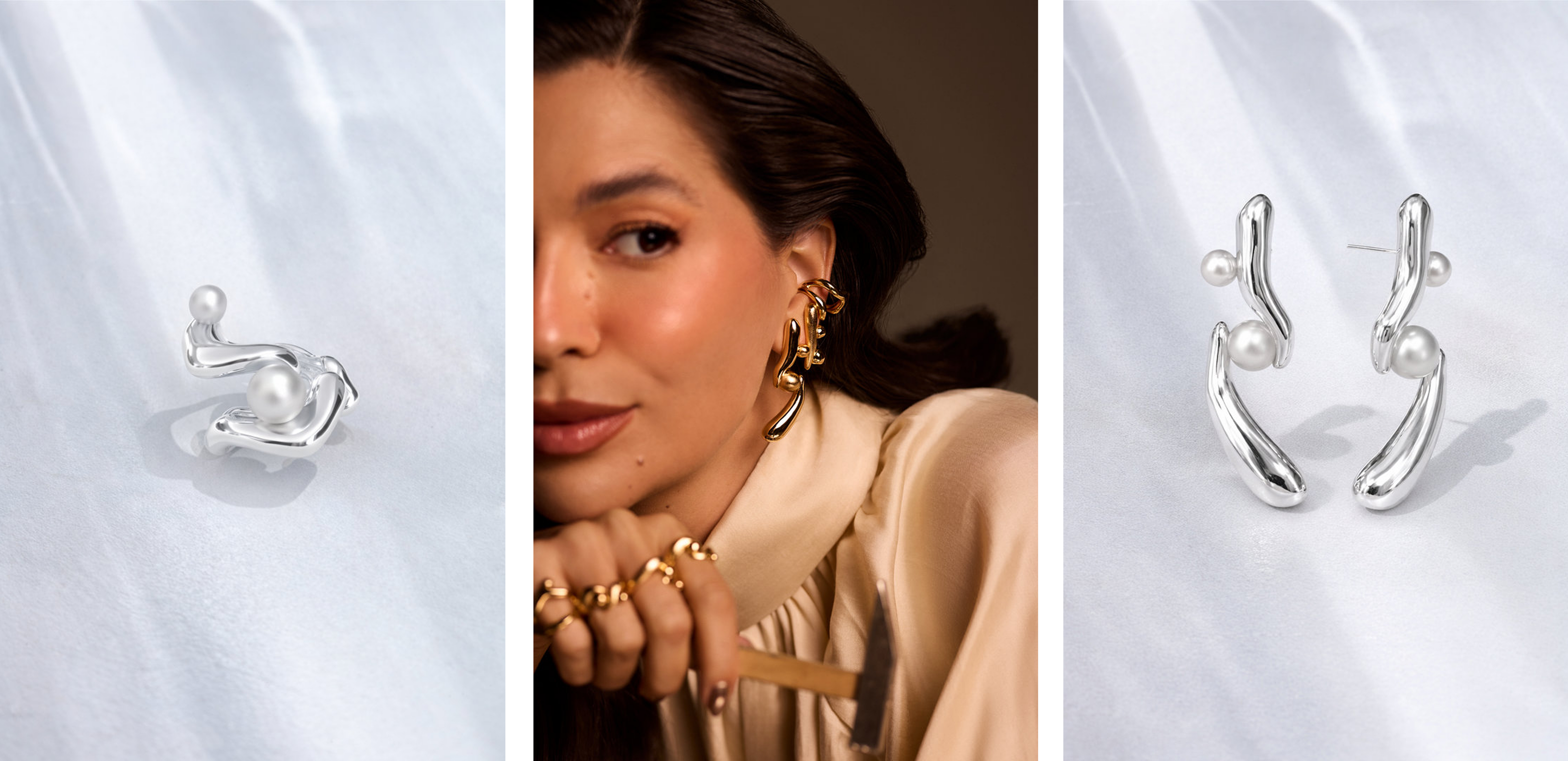 As formas assimétricas e suavemente onduladas evocam elementos naturais moldados pelo tempo. O metal liso e polido abraça as peças, conferindo uma aura de design contemporâneo.