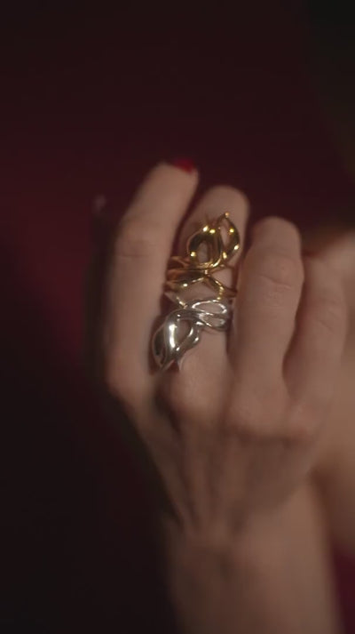 Anel regulável a partir dos aros 15 e 19, com folheação no ouro ou prata, com design inspirado nas chamas do fogo.