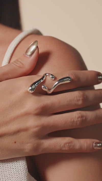 O metal escorrido, movimento fluido e a beleza do instante capturado traduzido em peças expressivas e modernas, o anel regulável tem movimentos orgânico de gotas alongadas e assimétricas.