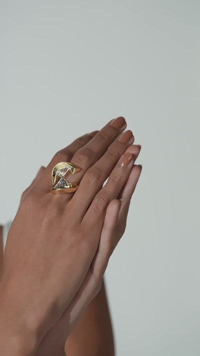 Curvas abstratas e fios que as interligam são responsáveis pelo contemporâneo anel que traz um jogo de banho em ouro e prata numa expressão moderna de identidade em um design de linhas que nascem e se expandem instintivamente.
