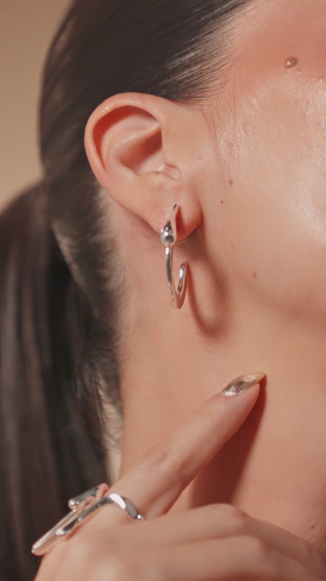 O metal escorrido, movimento fluido e a beleza do instante capturado traduzido em peças expressivas e modernas, as argolas finas e modernas trazem uma proposta atual com seu detalhe de gotas assimétricas em metal num acabamento extremamente polido.