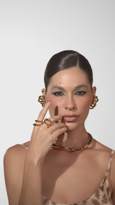 As curvas elegantes e fluidas da linha Dara representam a conexão e a raiz de toda a força do animal os movimentos circulares dão volume às orelhas e criam um semblante poderoso em quem os usa. Seu acabamento em metal liso e polido compõe o olhar com força e elegância.