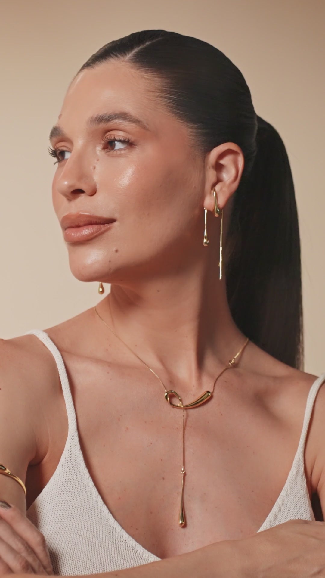 O metal escorrido, movimento fluido e a beleza do instante capturado traduzido em peças expressivas e modernas, o brinco tem movimento em seu detalhe removível e base q traz a ideia de gotas alongadas.