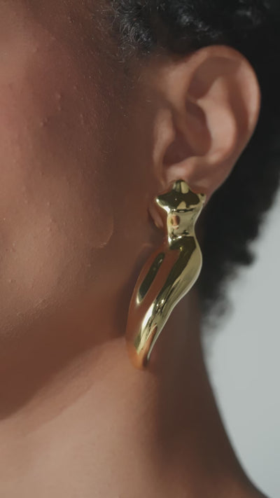 Brinco robusto e sofisticado que traz em seu design a anatomia orgânica feminina, numa representação de curvas em metal abaulado e trabalhado em um polimento de alta qualidade, suas tarraxas são grandes e sustentam bem brinco que vem banhado em ouro e prata.