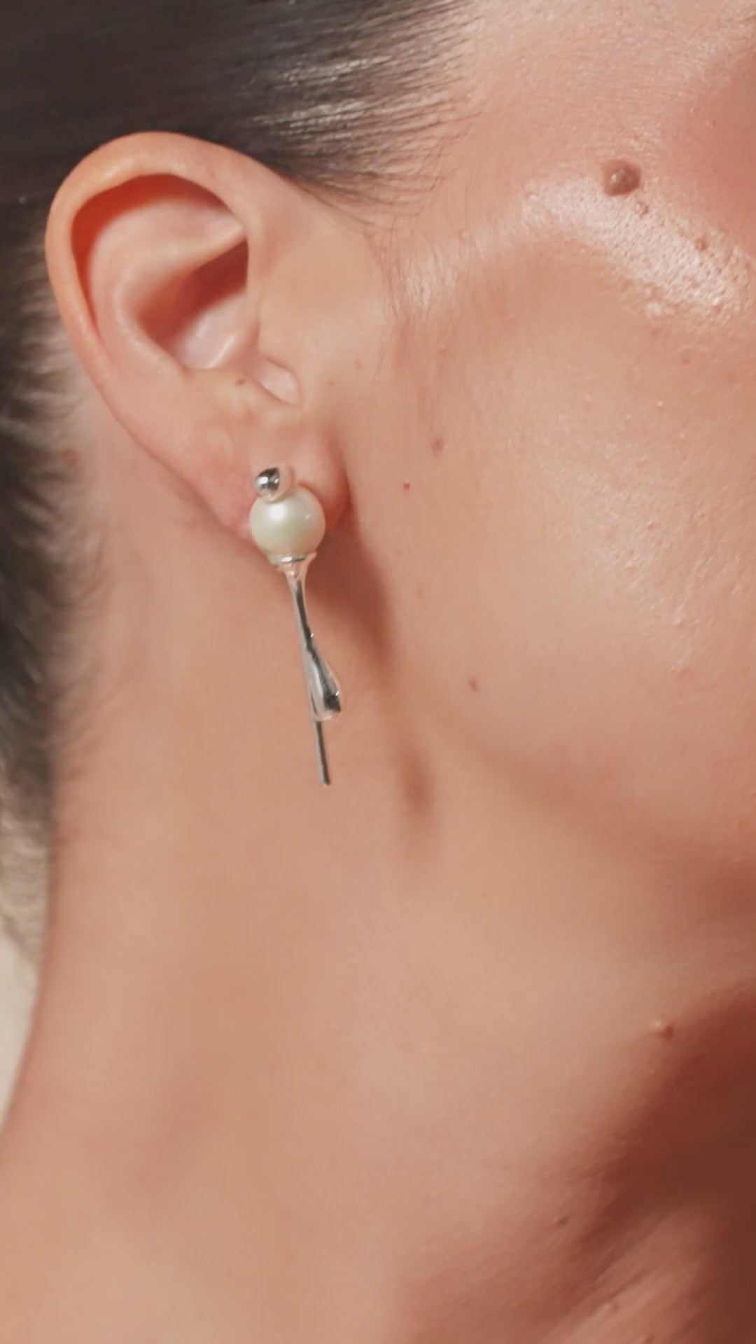 Brinco delicado e suave como gotas de orvalho que pousam sobre as folhas na aurora do amanhecer, o brinco traz pérolas verdadeiras e um design em meta de gotas e design alongado e minimalista.