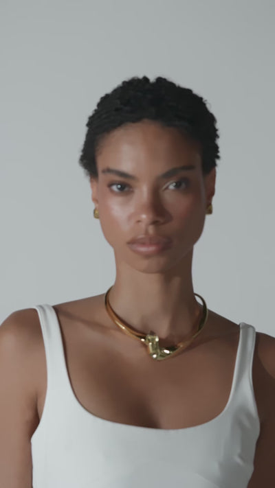 A dualidade do jogo de luz e sombra no banho dourado com ônix negro e dourado com quartzo cristal, apresentam no design as formas orgânicas e modernas que enlaçam e envolvem as pedras com lapidação exclusiva numa choker moderna e elegante.