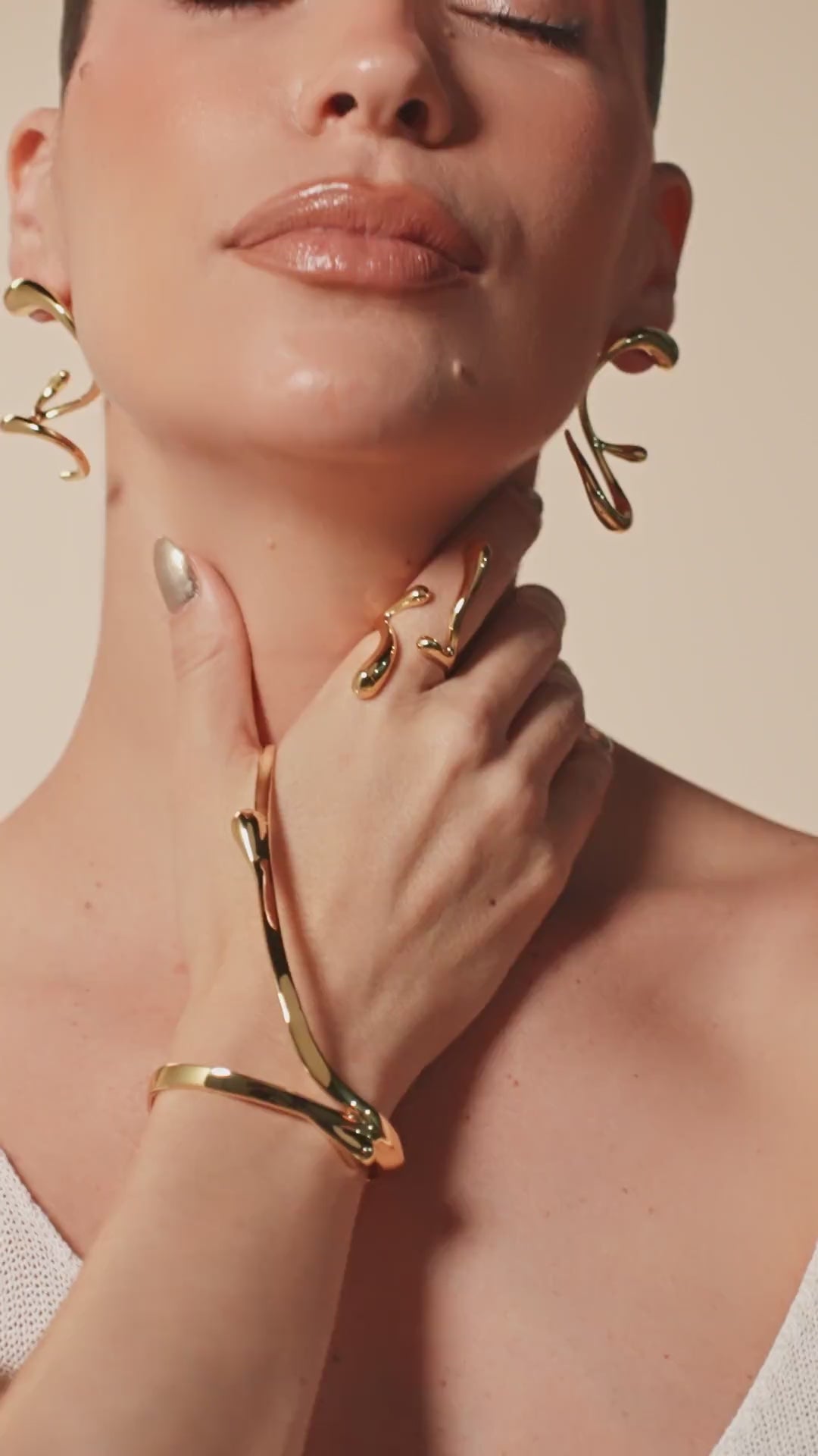 O metal escorrido, movimento fluido e a beleza do instante capturado traduzido em peças expressivas e modernas, a contemporânea pulseira de mão traz um ar moderno para essa coleção, acompanhando o design orgânico e minimalista de gotas de metal.